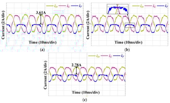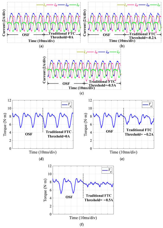 Figure 12 and Figure 13 present the experimental results under the upper switch OSF of phase F with the traditional FTC strategy. The various current judgement thresholds are 0 A, −0.2 A, and −0.5 A, respectively. The fault-tolerant performance is evaluated by analyzing the changes in the phase current, different subspace current, and torque. Figure 12a and Figure 13a,b illustrate the experimental results when the judgement threshold is set to 0 A. A comparison with Figure 11 shows that the experimental results reveal a minimal difference between operation under the upper switch OSF without FTC and with the traditional FTC when the judgement threshold is 0 A. As a result, FTC cannot be effectively applied during the conduction period of the upper IGBT. Figure 12b and Figure 13c,d present the experimental results when the judgement threshold is −0.2 A. For this threshold, obvious oscillations are observed in the phase F current and the xy-axis current during the conduction period of the upper IGBT, even with the application of FTC. The reason is that the phase F current fluctuates around −0.2 A during the conduction time of the upper switch, leading to discontinuities in FTC operation. As a result, although the intermittent application of FTC reduces the torque ripple, the torque ripple remains significant. Figure 12c and Figure 13e,f show the experimental results when the judgement threshold is set to −0.5 A. Apparently, the motor operates under FTC. However, with a judgement threshold of −0.5 A, FTC unnecessarily engages during portions of the lower IGBT’s conduction time when the current is smaller than −0.5 A.