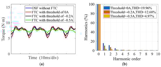 For a better understanding of the impact of different judgement thresholds on traditional FTC, the torque results under OSFs without FTC and torque with FTC under different judgement thresholds are compared in Figure 14. From Figure 14a, it can be seen that when the judgement threshold is 0 A, the torque with FTC is the same as the torque under OSFs without FTC. As seen in Figure 14b, the THD of torque decreases with lower judgement thresholds. It can be concluded that only lower judgement thresholds reduce torque ripples, highlighting the critical role of threshold selection in traditional FTC. The postfault performance of the conventional FTC significantly relies on threshold selection. Clearly, if the threshold selection is inappropriate, traditional current-based FTC cannot guarantee to enter FTC after a fault, nor can it ensure performance, thus lacking universality and robustness.