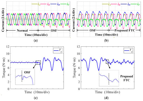 Dynamic performances of the proposed method with the change in operation mode under OSFs. (a) Phase currents from normal operation to OSFs. (b) Phase currents from OSF to FTC. (c) Torque from normal operation to OSFs. (d) Torque from OSF to FTC.