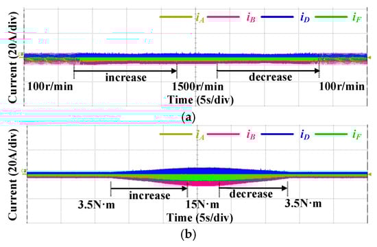 Further dynamic performances of the proposed method under OSFs with varying rotational speed and load torque are given in Figure 18. First, the rotational speed is step-changed from 100 to 1500 r/min and from 1500 to 100 r/min. The load torque is 7.5 N·m. The experimental results under OSFs are shown in Figure 18a. It can be seen that, with the change in rotational speed, the motor can still operate stably without overshoot and oscillation. In Figure 18b, the load torque is changed manually from 3.5 to 15 N·m and from 15 to 3.5 N·m, so the load change time is different. This will not affect the validation of the results. The rotational speed is 1000 r/min. Figure 18b illustrates that the motor can still operate stably without overshoot and oscillation. These results confirm that the proposed strategy achieves robust dynamic performance across different operational conditions.