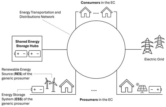 Figure 1 depicts the scenario considered. The EC’s members can be divided into residential and/or business consumers and prosumers, both having a crucial role. Prosumers provide the community with RESs generating clean energy and ESSs which can be exploited by the EC members. On the other hand, consumers allow the consumption of the locally generated energy, avoiding waste and stabilizing the community’s energy profile. Each EC member is also connected to the main electric grid. The prosumers’ ESS can provide energy to the EC members. The presence of a shared ESS is also considered, which can be charged by the available RESs and/or by the electric grid, if deemed convenient.