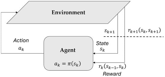 The mathematical framework provided by Markov decision processes (MDPs) is particularly useful to define reinforcement learning algorithms []. Indeed, MDPs are used to model decision-making problems in which an agent (i.e., the decision maker) interacts with a given environment by performing an action. More specifically, at the generic time instant , the agent observes the environment and measures its state . Based on this observation, the agent performs an action , inducing a state transition in the environment. After that, the environment transitions to the new state , and the agent receives a reward capturing the effectiveness of the action performed. The final goal of an MDP consists of finding the optimal policy mapping states and actions. In other words, the policy specifies which action shall be taken when the environment’s state is . Figure 2 depicts the above-described interaction between the agent and the environment in a deterministic environment. MDPs can thus be defined by the tuples , where and are the state and action spaces, respectively, and is the state transition distribution probability defined as