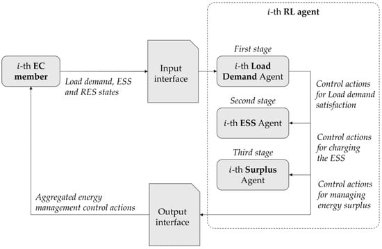 As depicted in Figure 3, the internal architecture of each RL agent envisages the presence of three sub-agents. The load demand RL agent is in charge of understanding the best strategy to satisfy the -th EC members’ load demand, considering the energy produced by the EC’s RESs, the EC’s ESSs and, if necessary, the electric grid. The objective of this first stage of the control procedure is to minimize the energy bill while maximizing self-consumption. The second stage of the proposed control procedure, tackled by the ESS RL agent, consists of learning the best strategy to charge the EC’s ESSs. This was done after the load demand satisfaction problem was addressed. In other words, the load demand agent provides the ESS agent with the updated state variables. Finally, the surplus RL agent is in charge of learning how to manage the possible surplus energy. In the considered EC scenario (described in Section 2), this implies considering the individual ESS, the shared ESS and also the electric grid.