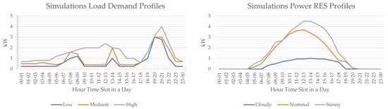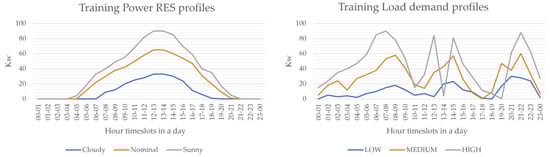 The EC model considered during the training phase consists of six members, classified into three different clusters, i.e., associated with different energy load demand profiles. Figure 4 depicts the baseline RESs’ energy production in three different scenarios and the load demand profiles for three considered EC member profiles. In each training episode, the number of EC members belonging to these profiles is randomly selected. As can be seen, the load demand and RES energy production profiles capture both energy-intensive buildings (e.g., an industrial building belonging to the EC) and residential buildings. This lets the RL agents visit all the possible state-action pairs and thus learn policies that can be adopted in many possible scenarios. These load demand and energy production profiles are used as a baseline: at each training episode, random variations of 20% are considered. In other words, the load demand of the -th EC member used during the -th training episode is