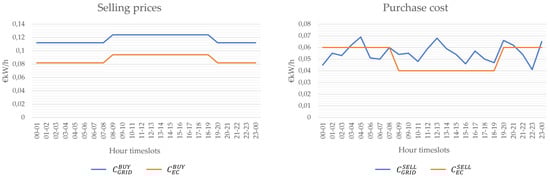 Finally, in relation to the unit costs of selling and purchasing energy from/to the grid and the EC, the average values applied in Italy by some grid operators were considered. These costs are reported in Figure 5.