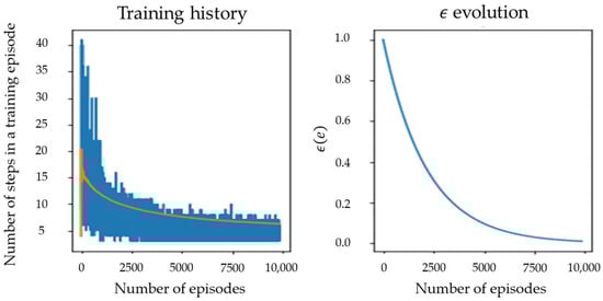 The training phase lasted 234 s, i.e., less than 4 min. It should be noted that the training could be arrested by defining specific stop conditions. As an example is the case when the updates of the visited Q-Function values are below a given threshold or when each state-action pair has been visited enough times. Of course, the Q-Learning convergence criteria shall always be considered. Figure 6 depicts the number of iterations required by the control algorithm and the evolution during the training phase. As can be seen from the left figure, the artificial agents are able to learn the optimal policy, and indeed, the required algorithms’ iterations converge.