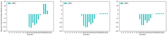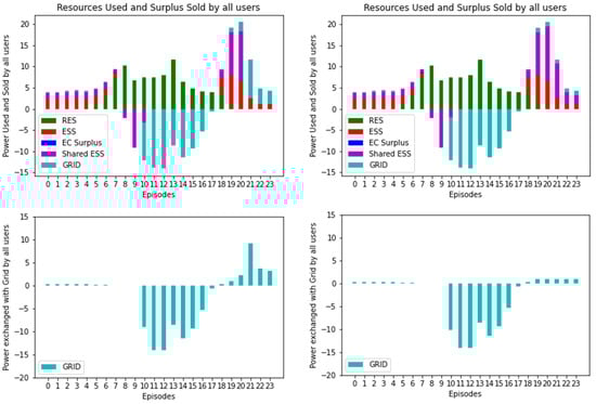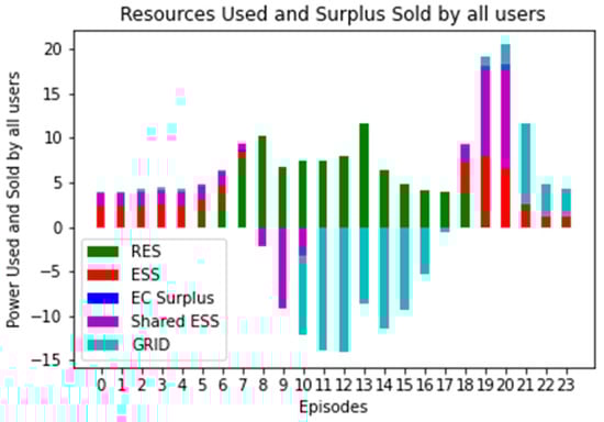 In this first set of simulations, the members’ and the shared ESS characteristics are the same as those mentioned in Section 4.1. It was assumed that the EC members’ load demand profiles are equally distributed among the three load demand profiles depicted in Figure 7. The simulation and resolution of the EC energy management problem for a day required 436 milliseconds, meaning that, for each discrete time instant, around 18 milliseconds were required to apply the learned control policy. This computational complexity renders the proposed algorithm suitable for real-time energy management policies. Figure 8 depicts the resources used to solve the considered energy management problem. More specifically, the green and red bars capture the usage of the distributed RESs and ESSs to satisfy the EC members’ load demand, respectively; the dark blue bars describe the amount of EC energy surplus consumed by the EC members; the violet bars describe the EC’s shared ESS charging process, where positive values mean that the shared ESS is used by the EC members, whereas negative values mean that the shared ESS is charged through the EC’s energy surplus; the light blue bars describe the energy exchange between the EC and the electric grid, where positive values express the power absorbed from the grid to satisfy EC members’ load demand, whereas negative values mean that the EC’s energy surplus is sold to the grid. As can be seen in Figure 8, during the hours in which the RESs produce little or no energy (i.e., in the time intervals 01:00–08:00 and 18:00–24:00), the artificial agents correctly absorb energy from the distributed and shared ESSs (the red and dark blue bars in the figure, respectively). Conversely, when the RESs produce energy, the EC members’ load demand is mostly satisfied by their RESs (green bars). During daylight hours, when a consumer is not able to satisfy their load demand through their RES, the EC surplus energy (in dark blue) can be used. Furthermore, during daylight hours, the EC members sell the energy surplus to the EC (to charge the shared ESS, in violet) and to the grid (to maximize their profit, in light blue).
