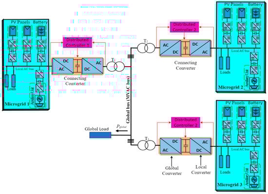 Interconnected microgrids consist of multiple (two or more) standalone microgrids that are geographically isolated and interconnected via different architectures for improved flexibility. Multiple interconnected microgrids accommodate more RES and utilise their reserve capacities to meet the demands of local and global loads while operating independently and cooperatively. Interconnected microgrids provide higher potential to enhance the network’s dependability, adaptability, durability, and sustainability. Interconnected microgrids exhibit a high self-healing capacity. During faults or outages that cause isolation to any part of the microgrid, the network can safely continue operation by sharing its reserve capacities with other microgrids connected to the network to achieve overall reliability and minimise load shedding [4]. The structure of the interconnection architecture is vital to enhance the performance of the respective microgrids under dynamic conditions and helps to provide mutual support. It is worth noting that the microgrid interconnection architecture varies depending on the support that the microgrid needs or delivers. Therefore, interconnected microgrids may not have a static interconnection architecture; instead, the interconnection structure and control strategy can change due to the connection/disconnection of the microgrid or other neighbouring utility grids. Microgrids can be interconnected in two major architectures, either as a common AC or DC bus, and a comparison of these and their benefits is provided in [2,3]. Due to this, various research efforts have been undertaken to solve the electricity problem in sub-Saharan Africa using the common AC bus, which is highly preferred because it is a cost-efficient technology, easy to implement, and allows ease of integration with existing AC links and other power system infrastructures in the region, as detailed in [2].