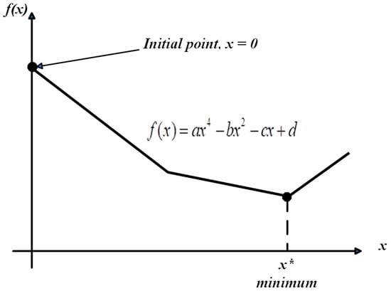 It is a design space with two dimensions if single-variable optimisation is considered, and the objective function is plotted against the design variables . Still, it can have any number of dimensions or sizes. However, is the notation for the minimum. Hence, the Nelder–Mead simplex algorithm minimises the objective function by starting from an initial point in the search space [58,59]. This initial point or guess does not have to be perfect because the simplex algorithm searches the design space to find the minimum. It is important to note that the Nelder–Mead simplex is applied for unconstrained problems and does not require any derivative information from the system. It is called unconstrained nonlinear optimisation because it finds the minimum of a scalar function of several variables, starting at an initial guess value, through repeated searching.