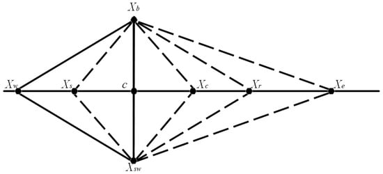 The first stage is to create an initial simplex, a collection of vertices in the n-dimensional space, and evaluate the fitness function to identify the optimal vertex. The simplex search of the cost function is evaluated at each of the vertices and reordered according to the cost function values to satisfy . As illustrated in Figure 4, the best, second-worst, and worst vertices are denoted by the subscripts , and , respectively, and and .
