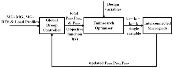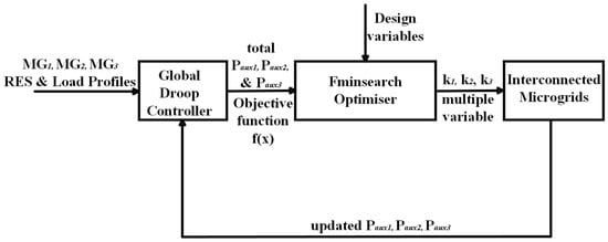 Simulations of the proposed centralised control and optimal energy management of multiple interconnected standalone microgrids were carried out in three cases. The first case simulation was carried out as single-variable optimisation, as described in the EMS flow model shown in Figure 5. This was unconstrained optimisation performed using a single gain value, “”, and the total auxiliary power from the three interconnected microgrids. The optimal operating cost was obtained and recorded as the minimal energy cost, representing the lowest objective function value. The second simulation case was three-variable optimisation performed using three gain values, “”, as illustrated in the EMS flow model in Figure 6.