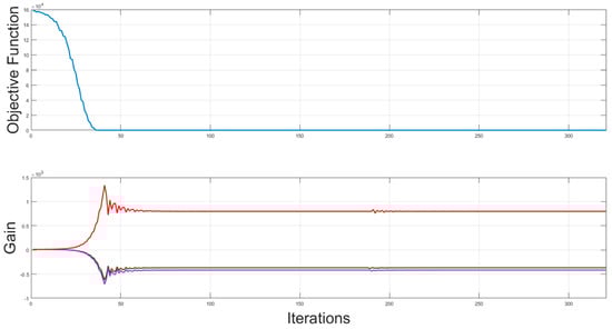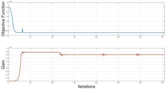 Figure 7, Figure 8 and Figure 9 present the combined cost-based objective function plots and gains for the algorithm’s three cases of optimisation runs for different initial points. In contrast, Table 2 shows the optimal cost comparison for the three cases against the benchmark. Figure 7 shows that the cost-based objective function values for single-variable optimisation started to be minimised from the initial estimate as the controller gain increased. The minimised cost function maintained a constant value across all iterations, even when the gain dropped below 1.7 × 106, and it was stabilised at about 1.6 × 106. Figure 8 shows that the objective function values for three-variable optimisation started to be minimised from the initial estimate, as the three gains tended to settle at different points at about 50 iterations. The cost function was minimised to a low value at about 40 iterations and maintained this low value even as the three gains maintained a near-constant value for over 300 iterations.