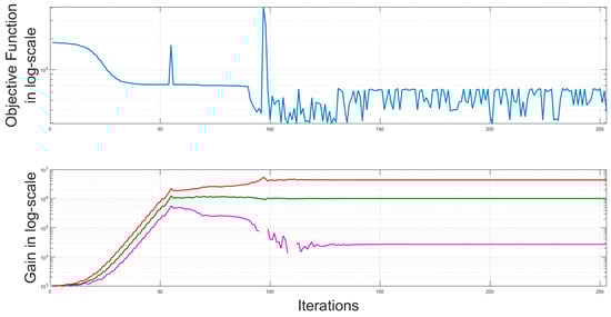 Nelder–Mead simplex objective function and gain for three-variable optimisation; red, green and pink coloured lines represent gain values for and respectively.