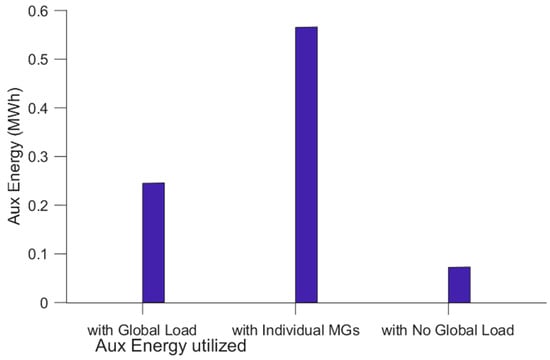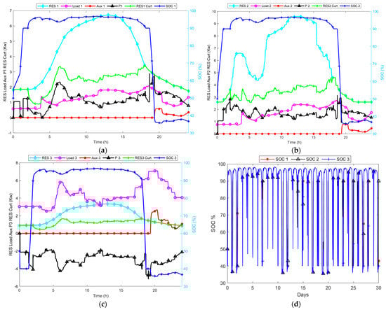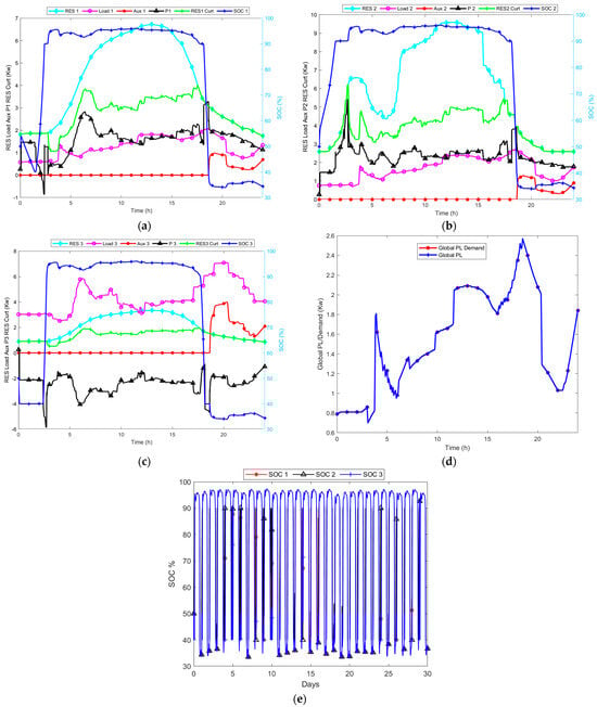 At the interconnected microgrid level, the balance between the power exported from the three microgrids and that consumed by the global load is continuously maintained to achieve an optimal energy balance. Individual microgrid units will increase in frequency during a surplus of power or decrease during a power shortage to communicate with other microgrid units and notify other units about the SOC of the BESS. If there is a power shortage, the microgrid will start demanding power, which will be imported from other microgrids. However, suppose that the microgrid is not obtaining the amount of power demanded. In this case, power will begin to be supplemented from the auxiliary unit to maintain the continuity of the supply and reliable operation. There is no direct communication, and power flows from one microgrid to another. However, the system prioritises exporting available power from the PV-based RES over curtailment. Therefore, the system exports power, and, if there is a power surplus, it starts to curtail the PV power. Similarly, the system prioritises importing power from other neighbouring microgrid networks over supplementing it from the auxiliary power supply.