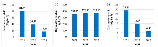 The FMY of JA aerial biomass was highest (81.5 Mg ha−1) in year 1. In years 2 and 3, the FMY was 52% and 79% lower, respectively (Figure 1a). The FMY of JA aerial biomass was lowest in the production technology without fertilization 34.3 Mg ha−1) (Table 7). The FMY increased by 32–40% in response to the N rate of 50 kg N ha−1, regardless of fertilizer type. An increase in the N rate to 75 kg N ha−1 was justified only when JA was fertilized with digestate (FMY increased by 18%). A further increase in the N rate (100 kg N ha−1) did not lead to a significant increase in FMY, irrespective of fertilizer type (Table 7). The DM content of JA biomass differed across each year. This parameter was lowest in year 1 (357.0 g kg−1), and it increased by 4% in years 2 and 3 (Figure 1b). The DM content of JA biomass was not significantly affected by the N rate or fertilizer type (Table 3 and Table 7).