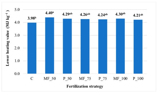 Lower heating value (MJ kg−1) of Jerusalem artichoke biomass (average for 2021−2023). Means with the same letter do not differ significantly at p ≤ 0.05 in Tukey’s HSD test. C—unfertilized control; MF_50—mineral fertilizers (50 kg N ha−1); P_50—digestate (50 kg N ha−1); MF_75—mineral fertilizers (75 kg N ha−1); P_75—digestate (75 kg N ha−1); MF_100—mineral fertilizers (100 kg N ha−1); P_50—digestate (100 kg N ha−1).