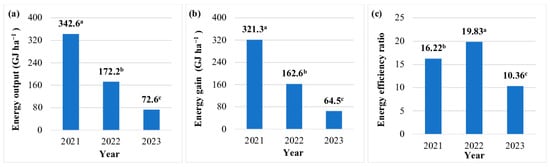 Energy balance in the production technology of Jerusalem artichoke biomass in each year of the study (average values for the fertilization strategy). Means with the same letter do not differ significantly at p ≤ 0.05 in Tukey’s HSD test.