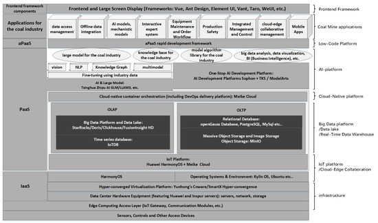 There have recently been rapid advancements in software technology, particularly the rapid development of open-source components, including IoT platforms based on Huawei’s HarmonyOS, relation databases like openGauss and PostgreSQL, time-series databases like IoTDB [1], and big data platforms like Doris, StarRocks [2], Clickhouse, and Huawei’s FusionInsight [3,4], as well as the continuous emergence of new applications for AI large models. By developing a fully integrated system based on cloud-native technology and low-code aPaaS platforms, these components can be continuously optimized to create a complete high-performance industrial internet platform, thereby improving the efficiency and automation of safe mining production and enhancing the efficiency of coal mine equipment operation and maintenance.