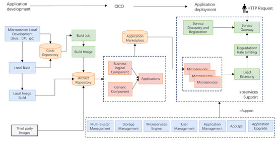 The cloud-native platform connects and integrates all the components and applications across the entire platform while managing application services. Cloud-native is a method for software development, deployment, and online application management. It leverages cloud computing features such as elasticity, scalability, automation, and distributed architectures to improve software quality, efficiency, and security. The core principles of cloud-native include containerization, microservices, continuous integration and continuous delivery (CI/CD), declarative APIs, and infrastructure as code (IaC). The Meike Cloud platform [17], a cloud-native solution developed using open-source projects, supports multi-language microservice architectures and continuous integration and deployment (DevOps), as well as resource management, deployment, load balancing, dependencies, routing, fault tolerance, containerized cluster deployment, elastic scaling, high availability, and observability of cloud-native applications. Figure 2 illustrates the cloud-native platform’s architecture.