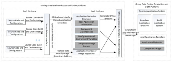 Mine-level edge cloud nodes connect external source code to build and configure components, arrange multiple components into a complete application system, and upload application metadata and images to the application market through the release interface provided by the application market. The applications are then remotely delivered to the coal mine intelligent integrated control platform for deployment and operation, and in subsequent upgrades, remote one-click upgrades can be achieved.