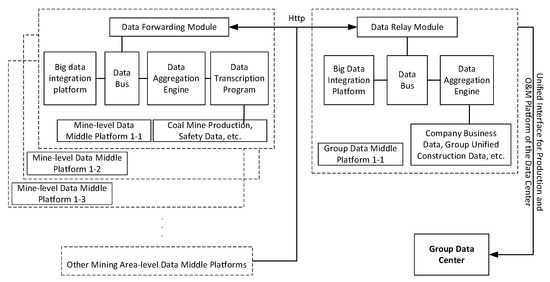 - Coal mine production and safety data are written into the local mine-end data aggregation engine through data transcription programs. The data aggregation engine then writes the data into the local data bus. The data-forwarding module processes the data in the data bus in real time, synchronizing them to the mine-area-level data-forwarding module.