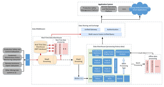 Figure 6, shown below, describes the data flow architecture of the intelligent operation and maintenance platform for the mining production equipment. The collected data are transmitted to the real-time data warehouse through the IoT platform and then modeled and layered into ADS, DW, and ODS to generate the data required by the business platform and to construct the dataset [14]. The real-time data warehouse also has multiple open-source big data components to choose from. For example, StarRocks is a new-generation ultra-fast all-scenario MPP (Massively Parallel Processing) database [2,3].