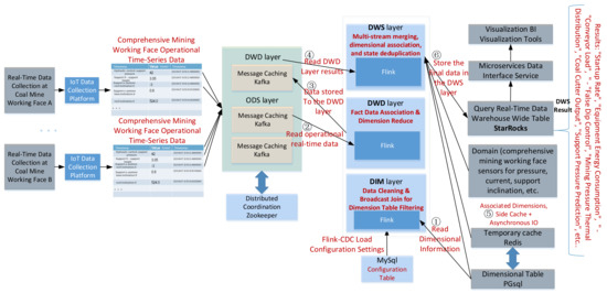 Steps (2) and (3) construct the DWD-layer data, while steps (4) and (5) construct the DWS-layer data. At this point, the DWS data of the real-time data warehouse have become the statistical result data that can be called by applications, including the mining face startup rate, equipment energy consumption, conveyor load, false slope control, etc., or predictive data, such as the coal mine periodic pressure. Different dimension tables and wide tables can be constructed according to different needs. The advantage of the real-time data warehouse is that it can timely calculate massive real-time data during production and synchronously obtain the required results, facilitating timely decision-making and adjustment of production tasks.