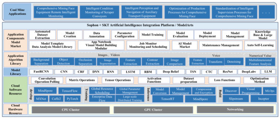 Using Sophon [20,21], AI models can be constructed quickly with simple clicks and mouse drag-and-drop actions. For example, a pressure prediction model for a coal mine comprehensive mining face or a coal mining machine health status model can be trained and deployed online in a short time. These models assess the health status of equipment based on various sensor parameters during coal operation, predicting the likelihood of faults in a timely manner. Due to the differences in each coal mining face, models need to be trained specifically for each mine, matching each model to its respective mining face. The model management capabilities of the Sophon platform allow for targeted model training, deployment management, and version control of application models for numerous mining faces. The application of these AI models and algorithms in fully mechanized mining faces significantly enhances the automation and intelligence level of mining operations.