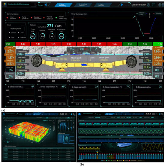 Figure 9a shows a big data analysis of miner working statistics and coal cutting planning analysis in a fully mechanized mining face. In the top left section, miner working statistics are displayed, such as the cutting number and working status, including the communication status, power status, and coal cutting planning status. The top right section shows the various stages of the coal mining cut. The light blue line represents the auto-planning coal cut stage, the blue line indicates the remote manual control stage, and the red line marks the pause stage. The x-axis represents the timeline, while the y-axis shows the miner positions. In the middle section, the real-time position and working status of the miner are shown. The bottom section displays the real-time measurements of the electric current (A) and temperature (°C) for the left and right cutting drums, respectively. These values can be used for AI analysis to enable proactive miner health prediction [27].