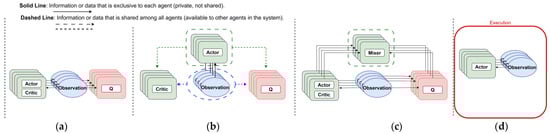 Centralized Training with Decentralized Execution (CTDE) addresses these challenges by allowing agents to use shared information during training while relying solely on local observations during execution, thus mitigating issues of non-stationarity and credit assignment. Centralized Critic, a CTDE framework shown in Figure 1b, requires access to all agents’ observations and actions for optimization after selecting actions, so the critic can accurately assess the impact of each agent’s actions. The decentralized actors (policies) only access local observations. This approach is effective in both competitive and cooperative environments because it can model adversarial interactions where agents compete, as well as collaborative ones. Another CTDE, Value Decomposition (VD), as shown in Figure 1c, differs from Centralized Critic in that agents are required to share only their predicted Q-values or critic values. This framework decomposes the global value function into individual agent-specific value components, enhancing coordination and aligning individual agents’ objectives with overall system goals. This approach is particularly effective in cooperative multi-agent systems. All three approaches only rely on their actors’ learned policies and local observations to make decisions in the execution phase, while the critic and Q-function are removed, as depicted in Figure 1d.