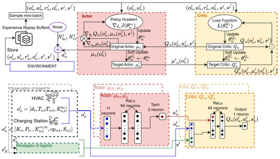 Action Space Design: The action taken by each agent n is defined as an hourly decision on EV charging and HVAC setting at time t to influence the system environment, i.e., = [, ]. Each agent n employs a deterministic policy πn: → , which maps its local observations to actions . Actions are normalized to the interval [−1, 1] to ensure consistent scaling and facilitate the neural network learning process. The designed agent actions and are transformed into EMS control variables and , as defined in (21)–(23), representing the energy supplied to EV charging and the HVAC thermostat setting, respectively.