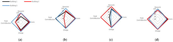 Figure 4 further elaborates individual building agents’ performance across four metrics—i.e., building rewards, peak contribution, energy cost, and charging satisfaction—with LSD-MADDPG showing the most balanced contribution, particularly in peak demand reduction, compared to other RL controllers. The closer proximity of the performance lines for each building agent indicates a more equitable load distribution among buildings, highlighting fairer participation across agents. The values are normalized such that the maximum value for each metric is set to 100%, with other values scaled proportionally. Higher values in building rewards, peak contribution, and charging satisfaction indicate better performance, while lower values in energy cost reflect greater energy efficiency. The LSD-MADDPG’s more balanced energy shifting (i.e., peak demand reduction) among buildings demonstrates that it secures a fair participation/coordination among agents, reducing the burden on any single building to manage the community energy demand. This more equitable cost/benefit distribution enhances system reliability by lowering the risk of over-reliance on specific buildings and improving scalability, allowing the system to remain effective as more buildings are included in the community EMS.