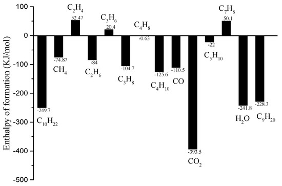 - Wang, Y.; Zhao, Y.; Liang, C.; Chen, Y.; Zhang, Q.; Li, X. Molecular-level modeling investigation of n-decane pyrolysis at high temperature. J. Anal. Appl. Pyrolysis 2017, 128, 412–422. [Google Scholar] [CrossRef]