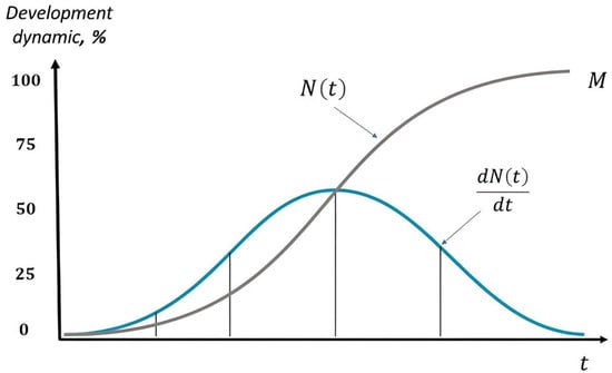 The founder of the innovative theory of cycles, Kondratieff, investigated the general course of the dynamics of cumulative quantities—for capital and population and their connection with the development of technology. As he states [43], he managed to prove that the law of change of cumulative elements is expressed by a differential equation, which was subsequently reformulated in terms of the introduction of innovative technologies and is considered a fundamental model of innovative diffusion [45]: