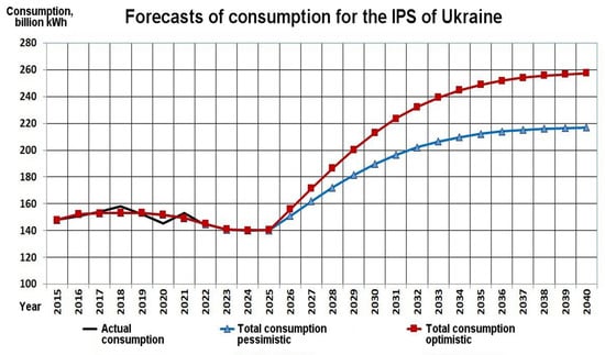 - First, with the help of the logistic model (7), the pessimistic and optimistic forecast of the consumption for the Ukrainian IPS up to 2040 (Figure 2) have been developed with the Formula (9):