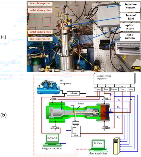 The RCCM (Table 2, Figure 2a) was fitted with the measurement-actuation equipment. The components of the equipment were coupled together through the HSD Sequencer C711 with a pre-programmed sequence of actions (activation of electromagnetic valves) in the controlling computer. The measurement signals from two AVL IndiModul 621 (Figure 2b) modules were subject to acquisition using the AVL IndiCom ver. 2.3 software (Concerto 5 by AVL).