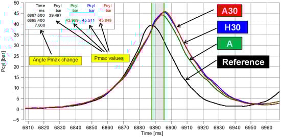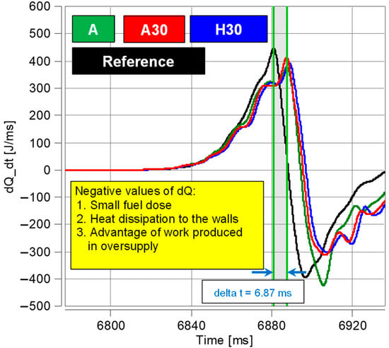 In the tests using RCCM, the quality of combustion was determined instead of the combustion time. The combustion time can be defined as the difference in the time when 90% of heat was released and when 10% of heat was released (Q90–Q10). To achieve this, it would be necessary to integrate the functions from Figure 4. As can be noted from the figure, these times were very similar. However, the quality of combustion (maximum heat release rate) was determined previously, as shown in Table 2. The heat release rate was the highest when burning A30 fuel, which was also confirmed by the maximum value of the cylinder pressure. It follows that the combustion of A30 fuel was thus the fastest. This is of great importance in high-speed piston and turbine engines.