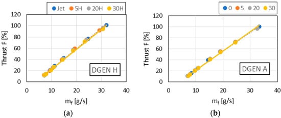 Engine tests were carried out using a DGEN 380 engine manufactured by Price Induction [37]. It was a turbofan engine that produced 255 daN thrust while maintaining low emissions and fuel consumption. The tests were carried out in a wide range of rotational speeds, which were regulated by adjusting the fuel mass flow (mf). During the tests, the measurement of thrust (F) and the temperature in the combustion chamber (T4) was carried out as well as the measurement of the concentrations of and in the exhaust gases.
