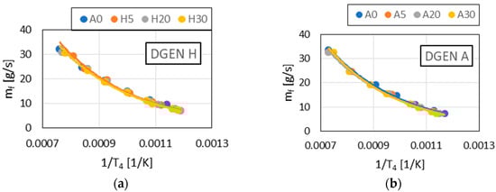 Kulczycki et al. [20] presented a relationship that allowed them, based on the measured operating parameters of the DGEN 380 engine, to determine the values of the activation energy of and formation and the appropriate reactivity coefficients and . The fuel flow rate mf was used as the independent variable, which influenced the values of other parameters treated as dependent variables. The relationships used in this paper are presented below.