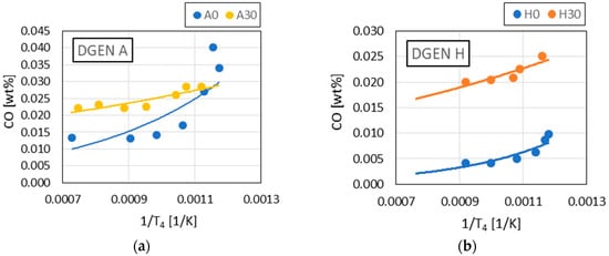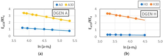 The obtained results of the DGEN 380 tests made it possible to determine the activation energy assigned to the combustion reaction chain of and . The values of activation energy determined for Jet A-1 and blends containing A and H components in concentrations of 5, 20 and 30 wt. % are shown in Table 4. The activation energy values assigned to the reactions chain leading to formation were determined for Jet A-1, A30 and H30 blends. The following values were obtained: