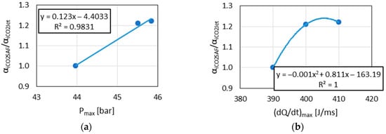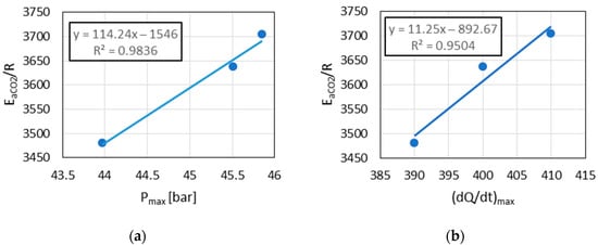 Hence, based on Figure 10, Figure 11 and Figure 12, through Pmax determined on RCCM, it becomes possible to predict the values of Ea and αi for DGEN. This in turn allows for the prediction of the SAF influence on the combustion process, including on and concentrations in exhaust gases. Of course, the relationships presented in this article require verification using a much larger database.