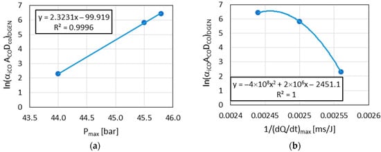 It has been assumed that the reaction chains, which occur during combustion processes in the RCCM and the DGEN 380 engine, were similar. This assumption allowed for the establishment of relationships between the parameters quantitatively characterizing the combustion processes of the fuels tested in the RCCM and the DGEN 380 engine. Consequently, the relationship between RCCM criteria and and the variables characterizing the combustion process for different fuels in DGEN engine should be determined. Ultimately, in this case, where the relationships between and on the one hand and , , and on the other hand can be determined, the RCCM tests can be used to predict the influence of SAFs on the combustion process, including and emissions from a turbine engine based on Equations (9), (10), (14) and (15).