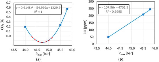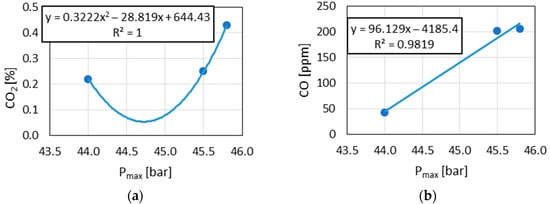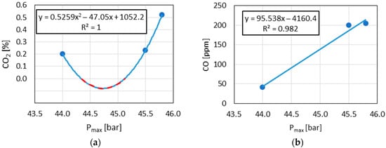 The demonstrated correlations between and in relation to combustion pressure did not indicate typical trends in the changes in these components. However, this article only made an attempt to create analytical procedures in this aspect. Increasing the number of data points would make it possible to obtain a more typical trend of these two exhaust components (i.e., inversely proportional concentration to concentration in exhaust gases).