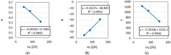 The relationship between parameters: (a) a; (b) b and (c) c and the fuel flow rate .
