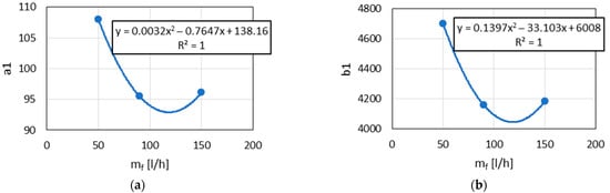 The empirically obtained relationships indicate that parameters of Equations (17) and (18) are functions of the fuel flow rate . These functions were obtained for the mineral Jet A-1 fuel and its blends with the SAF components A and H.