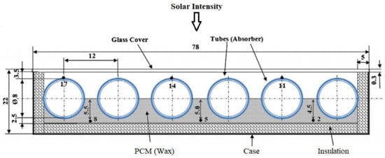 The solar collector system shown in Figure 1 is intended to assess the thermal performance of different phase change materials (PCMs) for energy storage. The solar collector designed by Khalifa et al. [23] is used in this study. The system consists of a rectangular box of 78 cm in length and 22 cm in height, with a glass cover that allows solar radiation to enter while reducing heat loss. Inside the case, many absorber tubes with a consistent diameter of 8 cm are stacked horizontally. These tubes capture solar radiation and transfer it to the surrounding PCM, which will be evaluated with two alternative materials to find the most efficient solution. The absorbed thermal energy is captured by the PCM, which experiences phase change. The case is insulated on the sides and bottom with 2.5 cm and 3.5 cm insulation thicknesses, respectively, to reduce heat loss and keep interior temperatures stable. This configuration allows for a thorough evaluation of the two PCMs in terms of thermal storage efficiency and suitability for maintaining consistent thermal energy output. The collector model is divided into two distinct zones: the PCM (phase change material) zone and the pipe zone. Different mesh strategies are chosen for each zone to optimize the simulation. Tetrahedral elements are used for both zones due to their suitability for complex geometries. However, the mesh density and refinement vary between the two regions, with finer meshes applied in areas where more detailed analysis is required, such as the PCM zone, to capture the heat transfer and fluid flow more accurately.