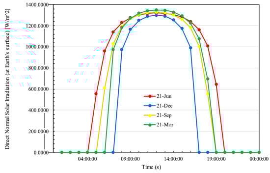 Direct normal solar irradiation throughout the day on 21 March, 21 June, 21 September, and 21 December in Babylon province, Iraq.