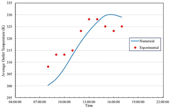 The numerical model developed in this study was validated against the experimental data provided by Khalifa et al. [23]. Figure 4 presents a comparison between the average outlet temperature of the solar collector predicted by the numerical simulation and the experimental results obtained by Khalifa et al. [23]. The data cover a period from early morning to late afternoon, showing the variation of outlet temperature over time.