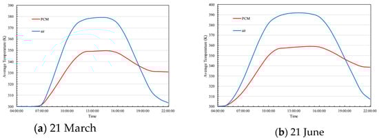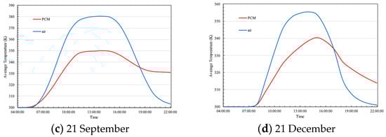Comparison of PCM average temperature variations over a day for different dates (21 June, 21 March, 21 September, and 21 December).
