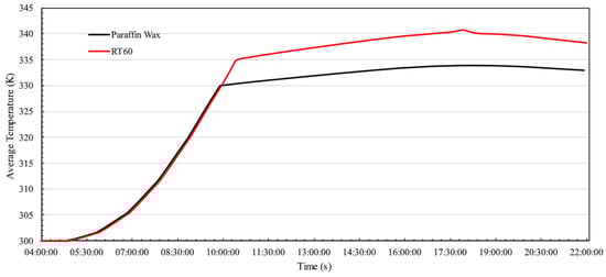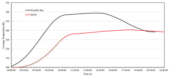 In this study, the system’s performance on 21 June, a peak summer day, is examined for two distinct phase change materials (PCMs), whose thermophysical parameters are listed in Table 2. The day of 21 June was chosen precisely because of the high ambient temperatures and long sunshine hours, which subject the PCMs to severe thermal stress. This enables a comprehensive examination of their heat storage and release capacities, as well as a thorough comparison of their performance in dealing with high thermal circumstances. The temperature profiles of paraffin wax and RT60 as phase change materials (PCMs) in a solar water heating system in Figure 6 reveal critical differences in their thermal performance. Both materials start at an initial temperature of approximately 300 K and exhibit a rapid temperature rise as heating begins. Notably, paraffin wax reaches its phase change temperature slightly earlier than RT60, indicating a quicker response to solar energy input, which could be beneficial for early-stage heat absorption.